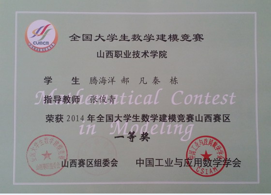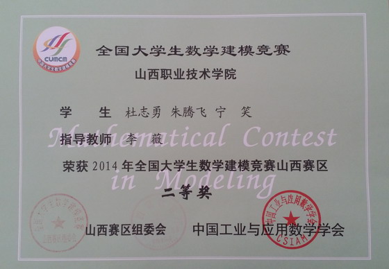 2014年山西赛区共有来自47所院校的1008支队伍参加全国数学建模竞赛,白菜官网代表队获得山西赛区一等奖1个,二等奖1个。