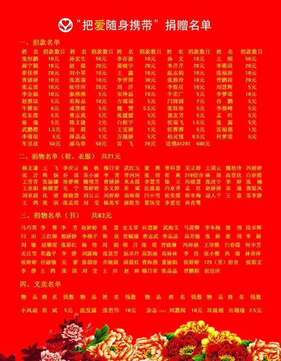 募捐活动中,共有200多名在校师生参与,获得募捐现金1307元,义捐书本折合现金83元,义捐鞋、服装折合现金21元,其余小商品义卖款总计29元。获得募捐物资价值累计1440元