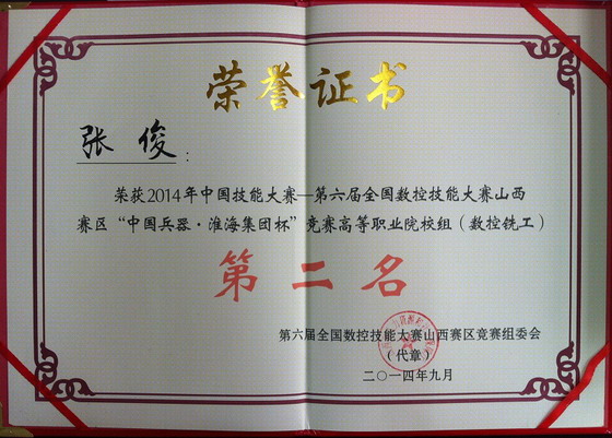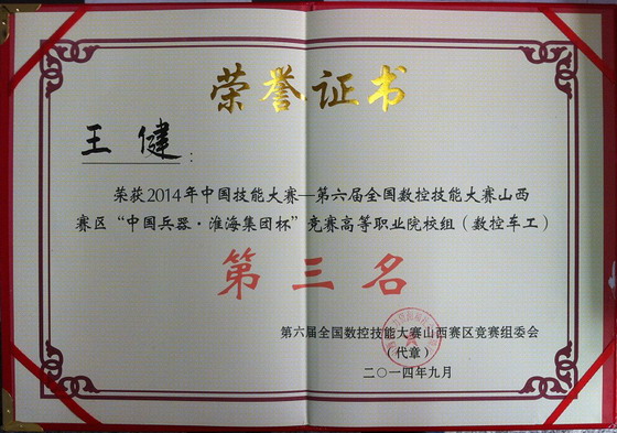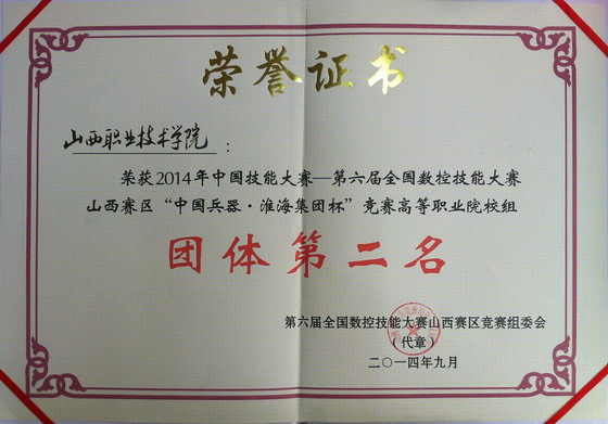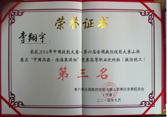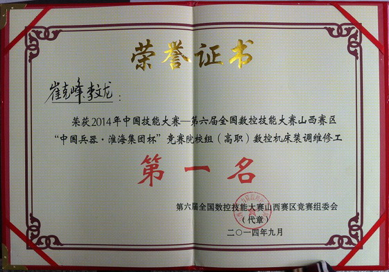 为加快山西数控高技能人才培养,引导企业职工和职业院校师生刻苦钻研技术,走技能成才之路,9月23日-29日,由省人社厅、省经信委、省教育厅、省科技厅、省总工会联合举办的2014年中国技能大赛暨第六届全国数控技能大赛山西赛区竞赛在长治开赛。此次竞赛白菜官网获得高职高专组团体第二名,其中崔克峰、李文龙师生组合参加的数控车床装调与维修项目获得山西省第一名。