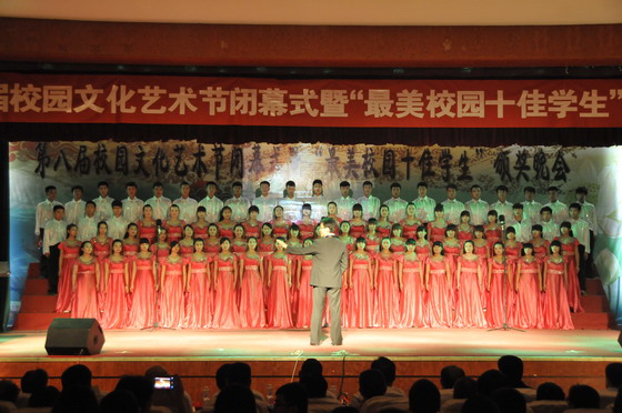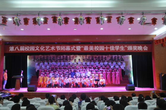 5月27日下午15点整,在《鲜红的旗帜》雄壮的音乐声中一块长10米的特大号红旗随着护旗手的跑动掠过观众席至舞台后方。由此拉开了第八届校园文化艺术节闭幕式暨“最美校园十佳学生”颁奖晚会的帷幕。