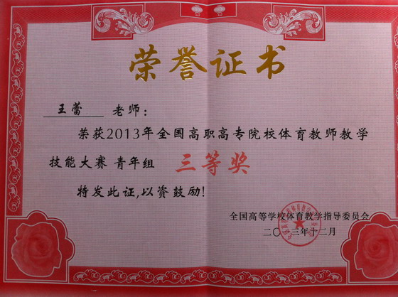 白菜官网社体部教师王蕾于2013年12月18日至12月22日期间,在浙江杭州参加了2013年全国高职高专院校体育教师教学技能大赛,通过初赛与复赛,最终荣获青年组三等奖。本次大赛共有全国17支代表队270余名教师参赛。