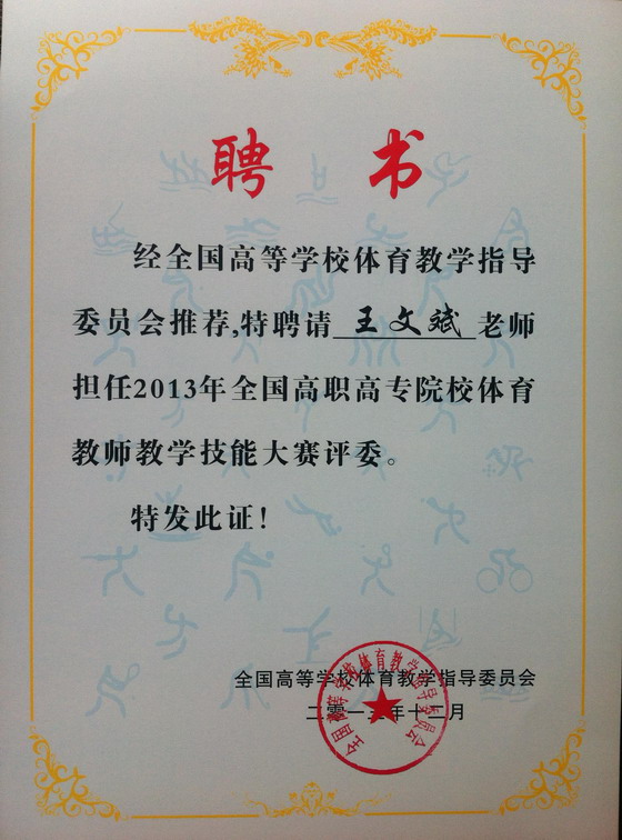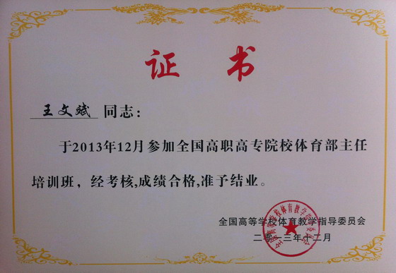 另外,本次大赛同时聘请白菜官网社体部主任王文斌老师为评委,并参加了全国高职高专院校体育部主任培训班,并授予证书。