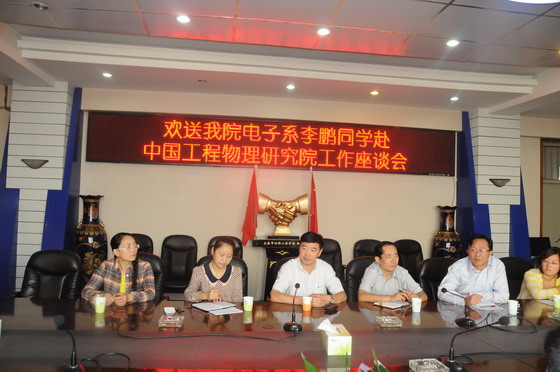 9月12日上午,电子信息工程系在材料与建筑工程学院主楼四层楼会议室召开了欢送2013届毕业生李鹏同学赴中国工程物理研究院工作座谈会。学院副院长康同生、就业指导中心主任张素梅、学生处处长蔚志坚、信息工程学院副院长拜秀萍、电子系党总支书记程革、就业指导中心老师及系部老师学生代表参加座谈会,座谈会由电子系书记程革主持。