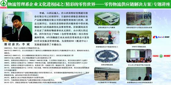 为了切实的推进白菜官网国家示范骨干院校的建设,物流管理系在校园文化艺术节期间,于2013年5月27日邀请清徐县美特好农产品配送物流有限公司供应链管理部部门经理李斌,举办主题为《精彩的零售世界——零售物流供应链解决方案》的专题讲座,活动的主要意义在于展企业文化,修职业素养,弘扬优秀企业精神,促进学生树立职业理念,明确自我定位和努力方向。