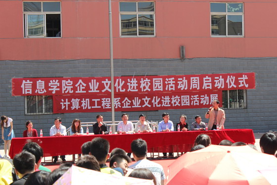 为了让学生在学校就能感受到校园文化和企业文化的双重熏陶,对学生产生潜移默化的影响,我系于2013年5月10日举行企业文化进校园活动展。学院副院长康同生、信息工程学院院长徐旭宁等相关领导出席了活动。信息工程学院院长徐旭宁在活动中发表了“展企业文化 修职业素养”的讲话。