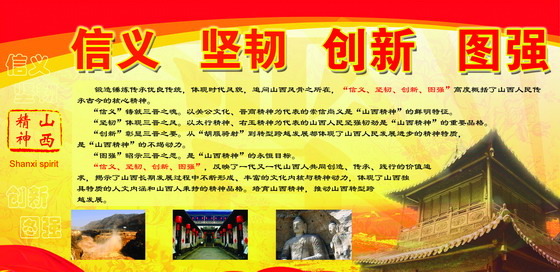 “信义、坚韧、创新、图强”的山西精神,高度概括了山西人民传承古今的核心精神。体现了山西人民崇信尚义、胸怀大局、敢于创新、自强不息的内在品质,是历史底蕴与时代呼唤的内在统一。