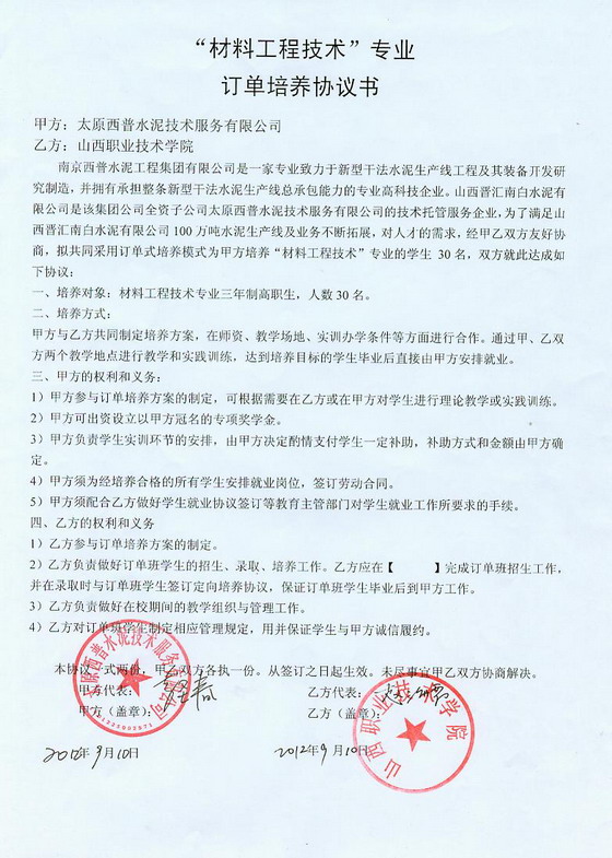 材料工程系近期与太原智海混凝土发展公司、山西晋汇南白水泥有限公司、太原福星斯达现代建材有限公司三家公司签订了订单培养协议,为三家用人单位培养2012级新生120人,学生毕业后可直接去企业工作。