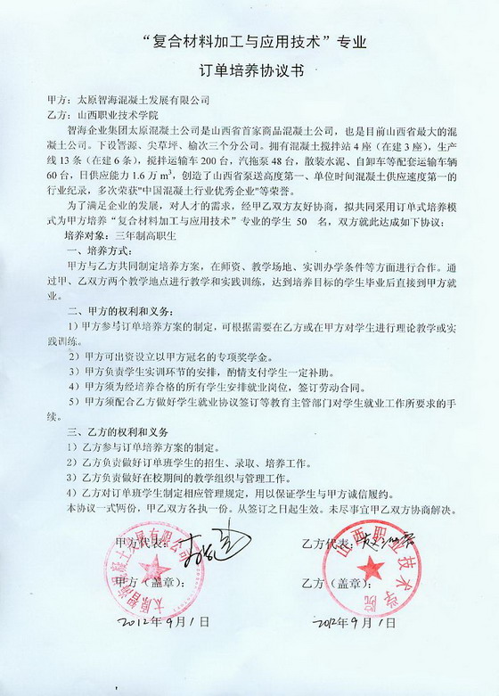 复合材料加工与应用技术专业(专业代码:550104,学制:三年,理工类)是“中央财政支持提升专业服务产业发展能力项目专业”,与太原智海混凝土发展公司签订订单培养协议,培养“复合材料加工与应用技术”专业的学生 50名。