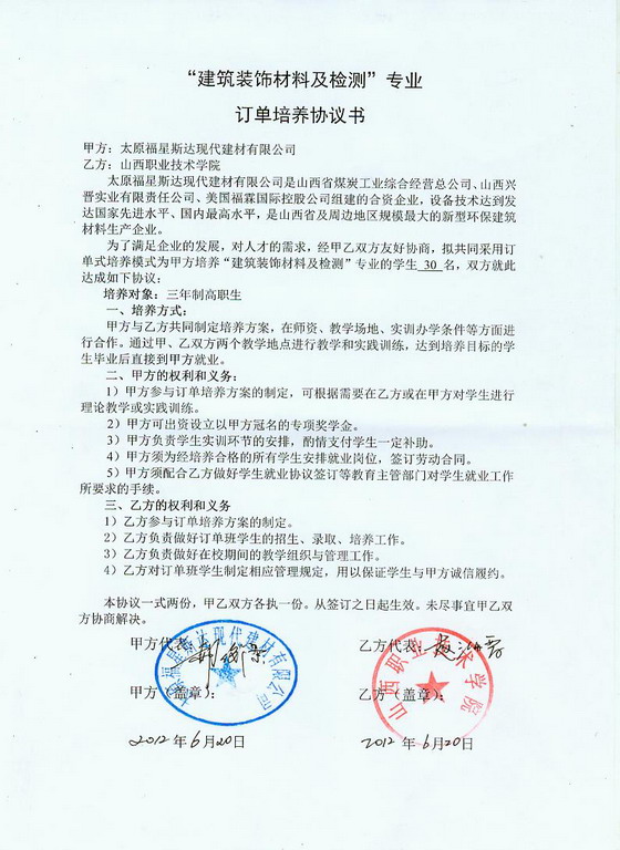 建筑装饰材料及检测专业(专业代码:550106,学制:三年,理工类),与太原福星斯达现代建材有限公司签订订单培养协议,培养“建筑装饰材料及检测”专业的学生 30 名。