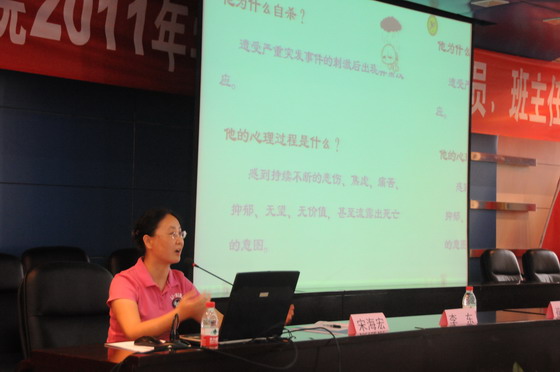 研讨会期间,学生处宋海宏就假期修订的班主任工作条例、学生综合素质测评等一系列制度作了详细说明;学生心理健康教育中心主任傅霞作了“高职生心理危机干预”讲座;学生资助中心主任李福转老师就学生资助的相关政策对所有与会同志作了详细讲解。