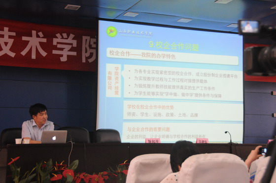 院长昝和平在会上从职业教育新理念、职业教育的模式、职业教育的三个定位、人才培养模式、人才培养方案、课程建设及课程体系开发、师资建设问题、校企合作问题九个方面作了转变教育教学理念专题辅导讲座。