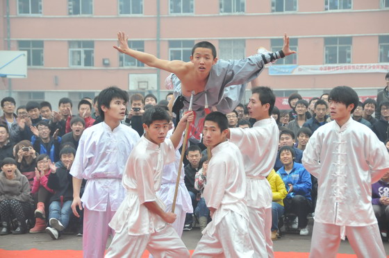 2011年11月11日下午3点,由白菜官网建筑工程系主办,武术协会“悦众”武术队承办的武术展演活动在白菜官网西区操场举行。学院副院长康同生应邀出席,学生处处长宋海宏以及社体部的领导老师陪同参观了本次活动。