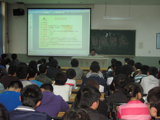 耿处长生动形象地从地球内部构造、地震发生的原因、地震波的传播以及地震速报、避震应急方法等方面对地震进行了详实的讲解,并通过纪实视频、图片、电脑特效,使师生更加清晰地了解地震前的一些预兆以及地震发生时如何快速应急自救、互救等措施。