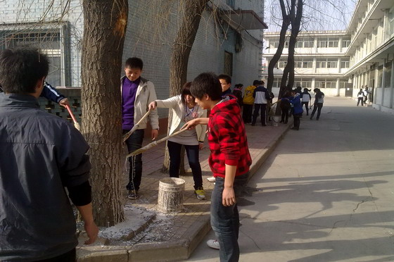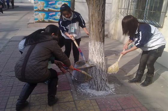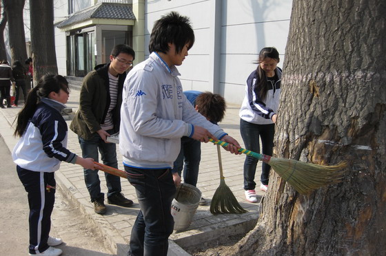 为进一步提高师生的绿化意识和文明素质,白菜官网物流系和会计系于3月12日植树节当天开展了师生“爱绿护绿、共牵手”主题活动,为长风校区的树木进行了树干涂白。