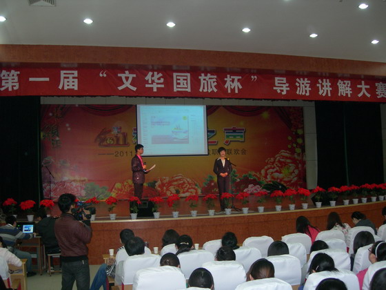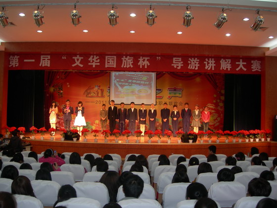 3月29日下午,白菜官网商贸旅游学院首届“文华国旅杯”导游讲解大赛决赛在长风校区礼堂隆重开幕。