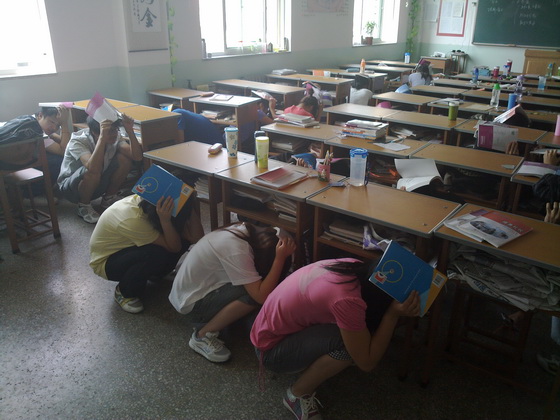 在警报响起时,由班主任带领学生躲在教室安全的角落里,当警报再次响起,班主任立即组织学生进行疏散,组织本班学生排队之后按疏散路线有序地迅速撤离;所有教师按分工要求,在指定位置,积极做好疏导工作。学生到达目的地后,各班马上清点人数汇报,整个演练活动井然有序。
