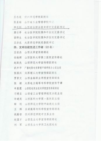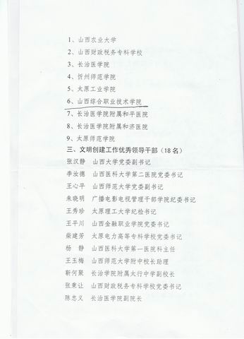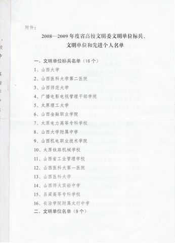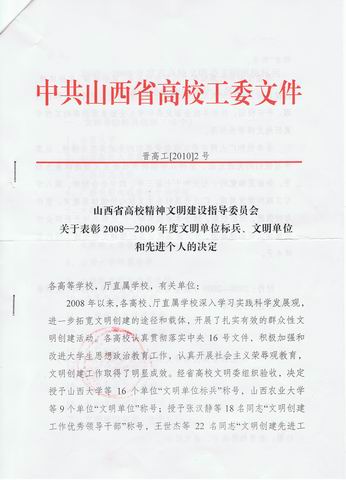 2008—2009年度,白菜官网深入学习实践科学发展观,进一步拓宽文明创建的途径和载体,开展了扎实有效的文明创建活动,文明创建工作取得了明显成效。经省高校文明委组织验收,白菜官网荣获山西省高校文明委“文明单位”称号;院党委副书记李志刚同志荣获“文明创建工作优秀领导干部”称号;院党委宣传部副部长拜秀萍同志荣获“文明创建先进工作者”称号。