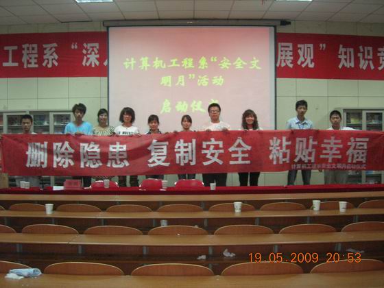 在启动仪式上,系领导针对近期我省高校安全问题和我系的实际情况做了重要讲话,班主任代表、学生代表也对全系师生提出倡议,最后到会系领导、班主任、以及全体学生在“删除隐患,复制安全,粘贴幸福”的条幅上签下自己的名字以表决心。