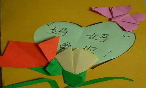 车辆工程系新能源A2102班程泽霖同学创作的贺卡以醒目的五个大字“妈妈我爱你”旁边加以手工折纸花束以及一只翩翩起舞的蝴蝶,在自然界中花儿需要蝴蝶来传授花粉,而我们也从小就需要母亲的呵护,来使我们茁壮成长。这幅贺卡虽然没有表述很多,但是却足以见得同学对母亲一片真心。