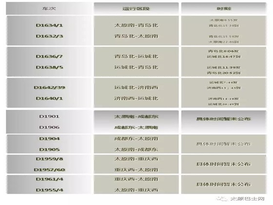 太原南-青岛北动车组一对,运城北-青岛北动车组一对,运城北-济南西一对,太原南-成都东两对,太原南-重庆西两对。