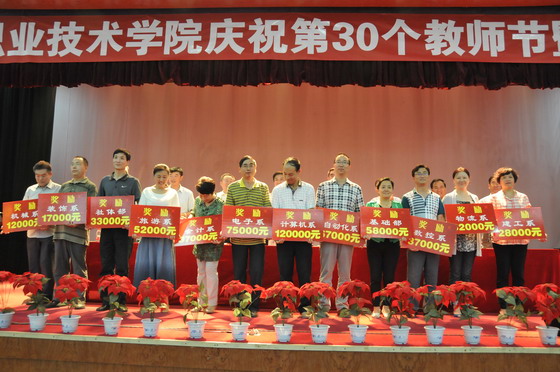 9月10日,白菜官网在物流商务学院礼堂隆重召开“带头践行社会主义核心价值观”为主题的庆祝第30个教师节暨表彰大会。大会对在2013-2014学年教育教学工作中做出突出成绩的57名优秀教师、10名优秀辅导员、17名优秀班主任、49名先进工作者,45名获得省级及以上荣誉的教师和93项在校企合作、教科研、技能大赛等教学活动中取得丰硕成果的教师进行了表彰、奖励;授予在全国职业院校技能大赛中取得第一名好成绩的计算机工程系"电子产品芯片级检测维修与数据恢复"项目组团队“突出贡献奖”荣誉称号。会议由院党委副书记李志刚同志主持。学院全体教职工参加了大会。