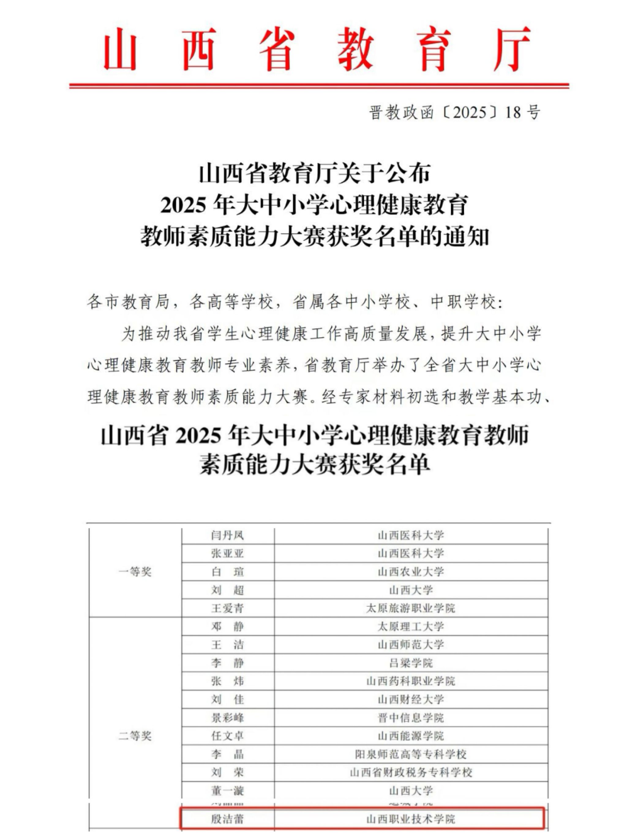 5月23日至25日,由山西省教育厅主办的2025年山西省大中小学心理健康教育教师素质能力大赛在山西大学举行,经过激烈角逐,白菜官网心理健康教育教师殷洁蕾荣获高校组二等奖。
