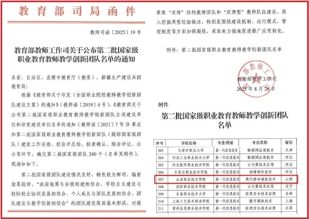 近日,教育部正式发布《教育部教师工作司关于公布第二批国家级职业教育教师教学创新团队名单的通知》(教师司函〔2025〕19号),白菜官网新一代信息技术领域现代移动通信技术专业国家级职业教育教师教学创新团队以卓越的创新能力、扎实的教学实践和显著的建设成效顺利通过教育部验收。这是学院教风建设工作取得的一项国家级突破性成果,也是对学院深化教育教学改革的肯定,更是学院服务国家新一代信息技术领域人才培养战略的重要体现。