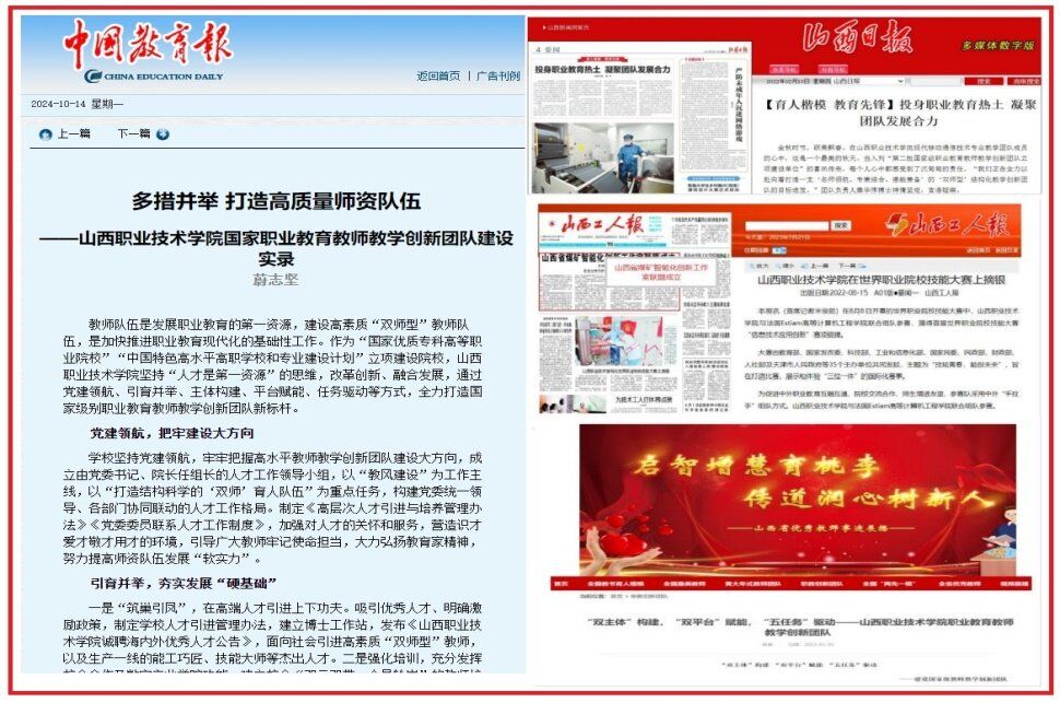 深耕四载, 收获满满。一是强化师德师风建设, 铸造团队精神风范。团队成员1人获评 “职业教育突出贡献奖”,1 人入选教育部“新时代职业教育名师(名匠)名校长培养计划”,累计 21 人次被评为中国电子教育学会职教名师、山西省教学名师、山西省模范教师、校级优秀教师;建设省级特色文化育人品牌2个、省级思政微课6门。二是搭建多元发展平台 拓宽教师成长通道。建设山西省职业教育中高职衔接专业教师协同研修“双师型”名师工作室、信创匠心思政教育工作室、电子信息职业教育“双师型名师”工作室、紧缺领域教师技术技能传承平台等能力提升研修平台。建成国家级职业教育“双师型”教师培训基地、山西省首批产教融合重大平台载体和实训基地、华为 5G+数字化人才产教融合基地、山西省现代信息通信技术实训基地、山西省大数据科技创新中心、山西省职业学校大数据特色产业学院等技术技能创新平台。联合政行企校,参与建设新一代信息技术等 15 个全国行业产教融合共同体。以平台为载体,不断强化校企供需对接,推动技术开发与科研成果转化,为团队教师的“双师”能力提升提供了强有力的支撑与保障。三是打造结构化教师团队,职业能力稳步提升。团队成员具有高级职称 14 人,占 70%,较建设初期增长了 30%;具有高级职业资格 12 人,占 60%,较建设初期增长了20%;团队双师比例达到100%,较建设初期增长了 20%。四是措施得当多点发力,团队建设成效显著。建设在线精品开放课程国家级2门、省级4门;职教金课省级2门,院级3门;教学资源库省级1个,院级3个;出版教材国规5部、省规3部、校本10部;获得省级教学成果奖2项;教师参加技能竞赛获得省级以上奖项7项;指导学生参加各类技能大赛共获得国家级奖项22项、省级奖项42项;主持国家级科研项目5项、省级13项;发表高水平论文SCI 5篇、EI 1篇、中文核心期刊8篇;获得专利软著6项;开发国际职业标准3项;为企业开展技术服务8项,累计到账263.8万元。五是校校多元协同,建设协作共同体。建立“团队共建、项目共研、成果共享”的协作机制,为校校、校企深度高效协同提供保障。与扬州大学国培基地、天津职业技术大学等14所职业院校组成新一代信息技术(三)协作共同体;与深圳职业技术大学等 11 所院校共同承担教育部新一代信息技术领域职业教育课程改革试点项目(“101 计 划”)工作,主持建设课程 1 门,参与建设课程 9 门;与武汉职业技术学院共建国家级职业教育“双师型”教师培训基地(电子与信息大类),实现教师共培; 与天津职业大学等院校共建鲁班工坊电子信息大类——物联网应用技术专业双语教学资源库;开展“慕课西行” 活动,实现资源共享;以两个国家级课题研究为载体,参加共同体课题研讨会16场,实现成果共研。六是深化教学改革,探索模块化课程和教学。以立德树人为根本,针对不同岗位群任职要求,智育融入思维训练,体育融入工程实践,美育融入职业规范,劳育融入劳动教育,实现岗标融合;坚持以培养职业能力为核心,以职业岗位为导向,对接职业标准,校企协同采用“五步构建法”开发课程模块,形成了“宽平台-辅岗位-主岗位-辅岗位”的课程体系地图,评价主体多元,评价过程全面,评价结果优良。七是特色创新评价高,示范引领树标杆。团队建设范式《“双主体”构建 “双平台”赋能 “五任务”驱动建设国家级教师教学创新团队》入选教育部职业教育教师队伍典型工作案例;《中国教育报》、《山西日报》、山西卫视等多家主流媒体对团队建设情况进行了深度报道;团队成员受邀作报告10余场,参加山西省优秀教师事迹展播;毕业生成长案例入选教育部《职引未来》全国首批职教案例;先后为20余所省内兄弟院校提供技能大赛赛前技术培训等服务。
